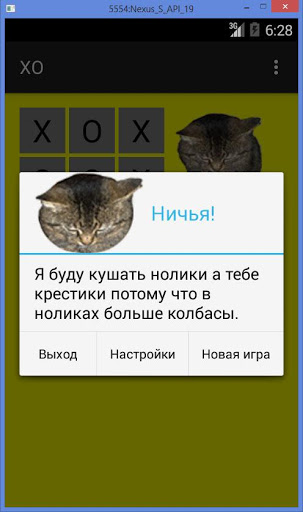 Режим игры колбасой. Осторожно время от времени Кот может красть крестики или нолики. И даже если вы играете в режиме против другого существа, это никак не остановит моего Кота, и он все равно будет воровать колбасу (тщательно протестировано на практике)!