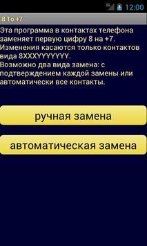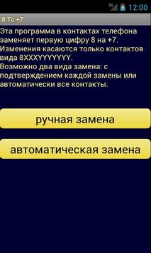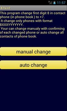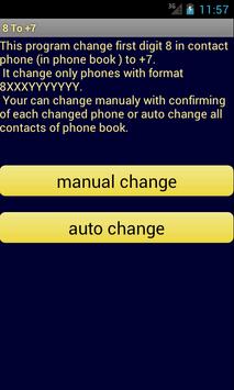 This program change phone from 8XXXYYYYYYY to 7XXXYYYYYYY in your phone book.(i.e. change phone 89161234567 to phone 79161234567). There are 2 modes: 1) manual - confirm each change 2) auto - change all phones like 8XXXYYYYYYY to 7XXXYYYYYYY.