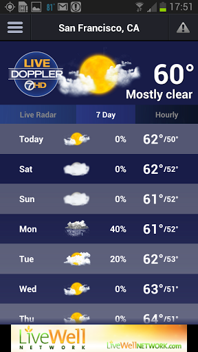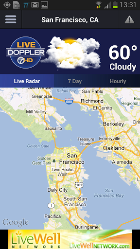 KGO-TV San Francisco. With ABC7 Weather: SF/Bay Area, when threatening weather is nearby your phone can be set to alert you!weather alerts are read aloud for you so you don’t have to stop to read the screen. It’s the power of a NOAA Weather radio combined with the accuracy of AccuWeather and ABC7 News for San Francisco and the Bay Area all in one convenient app!There’s no other app like it.With the FOLLOW ME feature you’ll stay safe when you’re on the go.ABC7 Weather: SF/Bay Area can alert you to severe weather wherever you are -- whether you’re on your daily commute in the Bay Area or travelling anywhere across the U.S. ABC7 Weather: SF/Bay Area is fully interactive; Zoom down to get a street level view of live conditions. And of course, get current conditions, hourly and long-term forecasts right at your fingertips.FEATURES:* Follow Me – Activate this feature so that you get weather alerts wherever you are, anywhere in the U.S. No matter where you travel, the app will help keep you safe.*Set a static location – In addition to the Follow Me feature, you can set three (3) additional locations to receive alerts on.So if you’re on the road, you could still get alerts for what’s threatening your home, or where a loved one lives.* audio alerts – Listen to weather alerts just like a NOAA Weather Radio, so you can be informed and keep moving.* Current Conditions, Hourly Forecasts and 7 Day Forecasts.* Video forecasts and live weather video (when available).