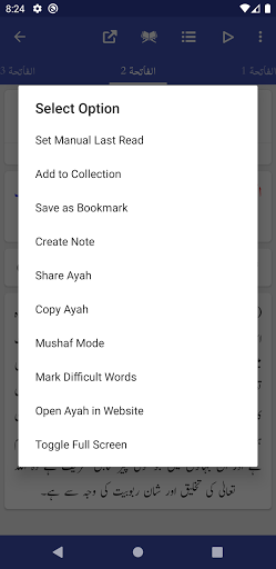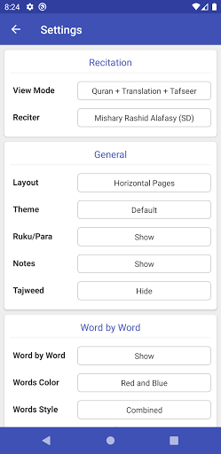 - Mushaf Mo De: ท่องอัลกุรอานด้วยการแปล (Tarjuma) หรือ Tafseer - โหมดการแปล: ท่องคัมภีร์กุรอาน (TarJuma) เท่านั้น - แบ่งปัน Ayat หลายรายการ - ดูข้อมูล Ruku และ Para สำหรับทุก Ayah