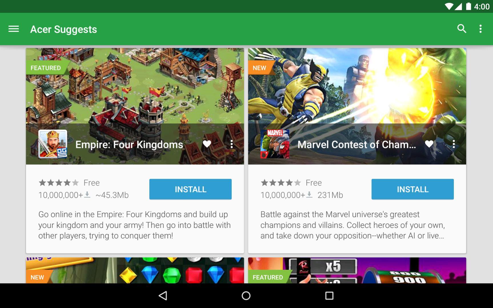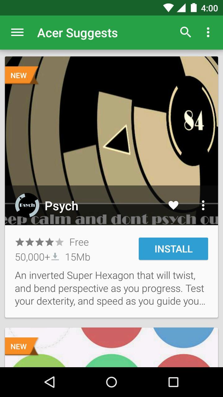 Acer Suggests is the best path to the newest Android Apps and Games! Optimized for Acer devices, Acer Suggests helps you discover new apps & games and will recommend the best ones for you based off of your preferences. Focused on FREE Top Apps & Top Games, Acer Suggests makes app discovery fun and easy!