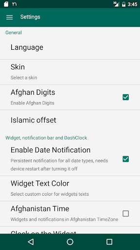 ผู้ใช้สามารถควบคุมแอปพลิเคชันได้อย่างเต็มที่โดยเลือกตัวเลือกที่เหมาะสมจากการตั้งค่า การตั้งค่ายังมีรายชื่อจังหวัดอัฟกานิสถานเพื่อเลือกที่จะมีเวลาสวดมนต์ที่ถูกต้อง ผู้ใช้ยังสามารถป้อนพิกัด GPS เพื่อให้มีตำแหน่งที่แน่นอนของพวกเขาและแอปพลิเคชันยังมีความสามารถในการดึงพิกัด GPS ที่เหมาะสมโดยอัตโนมัติโดยอัตโนมัติโดยอัตโนมัติโดยใช้อุปกรณ์ GPS