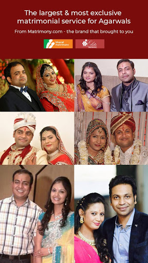 แอพ Agarwal Matrimony เป็นส่วนหนึ่งของการแต่งงานของชุมชนจาก Matrimony.com ซึ่งมีภาษาตาม บริการเกี่ยวกับการแต่งงานเช่นเดียวกับการแต่งงานภาษาฮินดี แอพนี้ได้รับการออกแบบให้คำนึงถึงการตั้งค่าพันธมิตรต่าง ๆ ที่เจ้าสาวหรือเจ้าบ่าวอาจมีในขณะที่เลือกคู่ชีวิตของพวกเขา แอปพลิเคชัน Matrimony Agarwal ได้รับการพัฒนาอย่างชาญฉลาดเพื่อให้ผลลัพธ์ที่ดีที่สุดในขณะที่จับคู่คุณกับคู่ชีวิตของคุณ