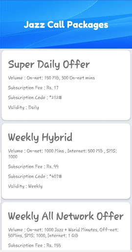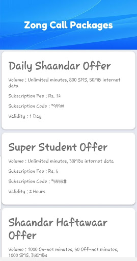 SIM Packages ในปากีสถานเป็นแอปพลิเคชั่นมือถือซึ่งออกแบบมาเป็นพิเศษสำหรับผู้ใช้มือถือปากีสถาน มันมีแพคเกจซิมทั้งหมดของผู้ให้บริการโทรคมนาคม / เครือข่ายรวมถึง Zong, Warid, Jazz, Telenor และ Ufone