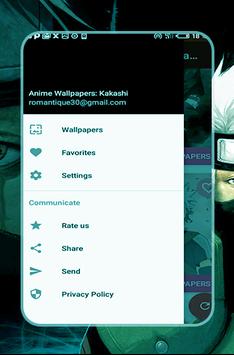 Other information is available in " Anime Wallpapers Kakashi " in the option: "settings": name of the application: " Anime Wallpapers Kakashi " build version, evaluation and notification to give your opinion on the service, share with contacts, other suggested apps, contact us, and privacy policy.