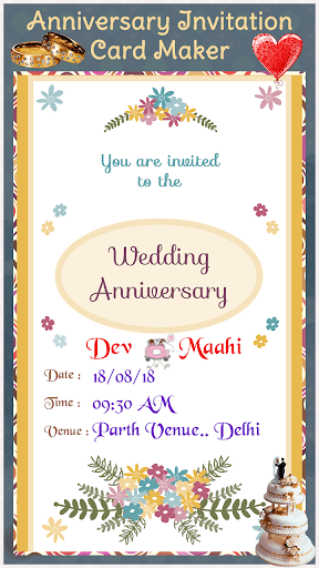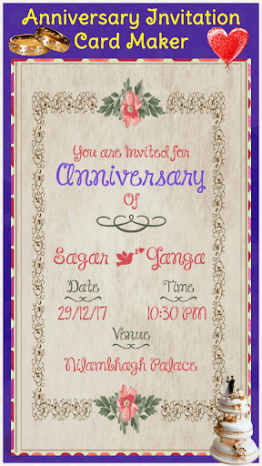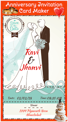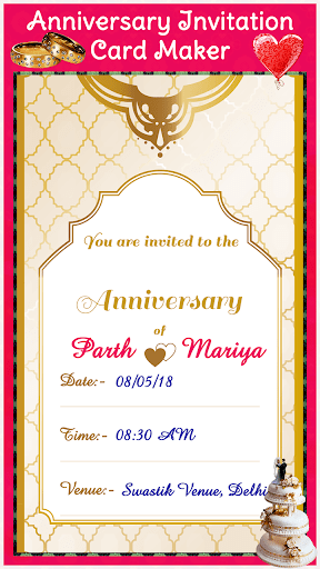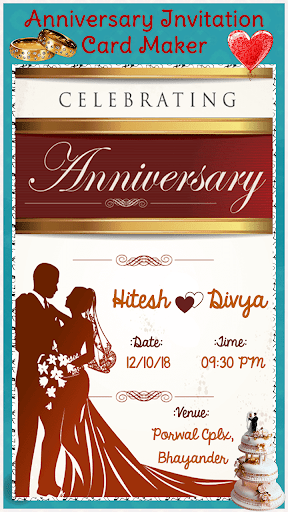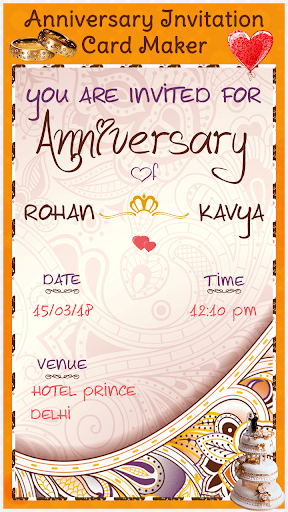 การใช้มือถือของคุณคุณสามารถสร้างการ์ดเชิญที่สวยงามด้วยธีมที่สวยงามของเทมเพลตการ์ดครบรอบและเขียนชื่อบนการ์ดของแขกของคุณด้วยข้อความที่มีสีสันและฟอนต์และส่ง เชิญด้วยเครื่องชงการ์ดเชิญครบรอบ