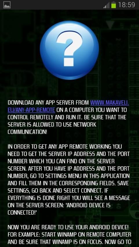 Install Any App Remote on your Android device. Download Any App Server from http://www.makaveli.eu/any-app-remote/ and run it on the remote computer. Be sure that the server is allowed to use network communication! Get the server IP address and the PORT number which you can find on the server screen. Run Any App Remote and go to SETTINGS. Input server IP address and PORT number in the corresponding fields. Save settings, go back and select CONNECT. If everything is done right you will see a message on the server screen: "Android device is connected!". Now you are ready to use your Android device!