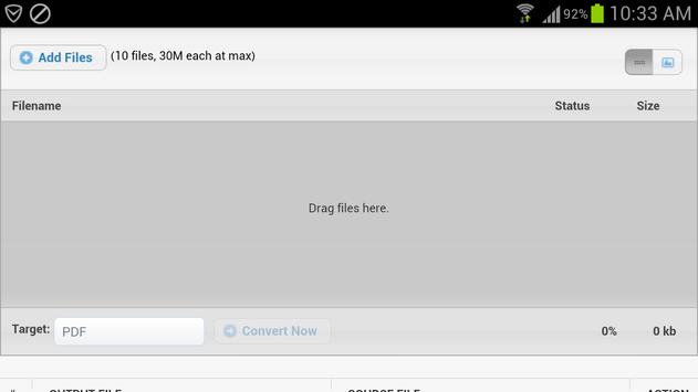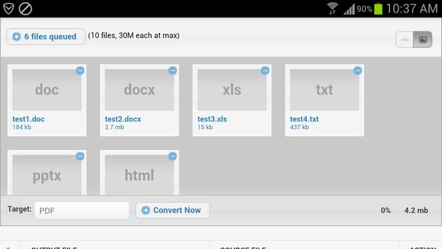 Any File Converter is easy to use. Just add a batch of files on your Android phone, choose a target format, and tap the "Convert Now" button to convert. You can convert different file formats at the same time. For example, you can add JPG, DOC, XLS, PPT, XPS, TXT and HTML files on the list and convert all the files to PDF files. Any File Converter will automatically convert these files on different servers and return output files for you to download when conversion is complete.
