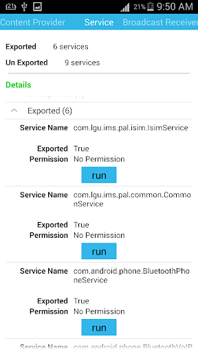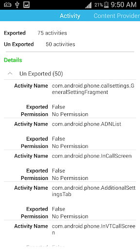 * List full information & android components (activity, service, broadcast receiver and content provider) with their information (name, permission...)