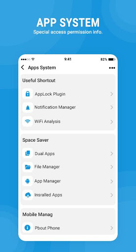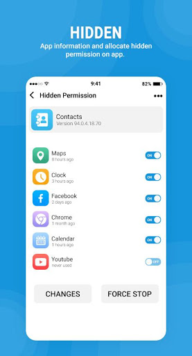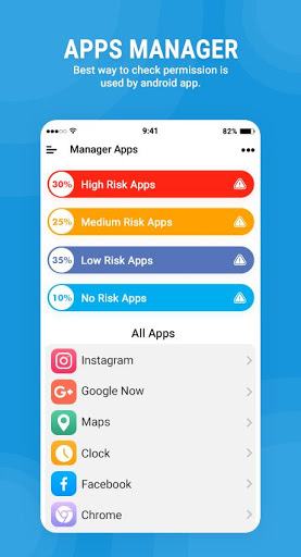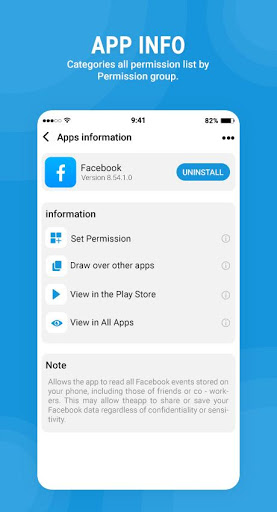 แอพนี้มีรายการสิทธิ์ทั้งหมดที่ใช้โดยแต่ละแอปอนุญาตให้อนุญาตและไม่อนุญาตโดยตรงจากแอปพลิเคชันนี้และแอปยังชี้ให้เห็นว่าการอนุญาตที่ปลอดภัยและมีความเสี่ยงในแง่ของการปกป้องข้อมูลและความปลอดภัย