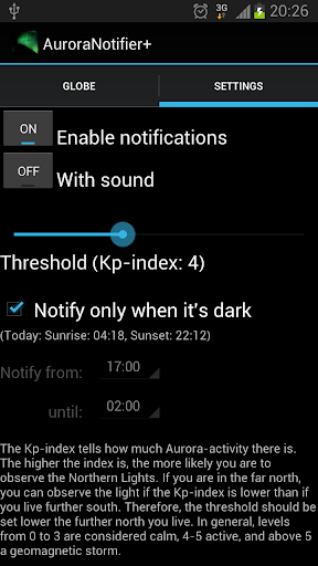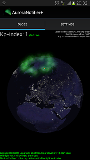 Install this package, then restart AuroraNotifier. There should then be a " " after the app name and your location should be marked with a red dot on the globe.