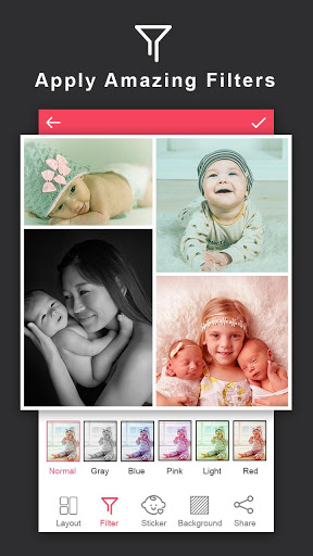 Baby Pics Collage Maker can give you the best effect to your baby images and add multiple baby photos within seconds to make a beautiful Baby Photo Collage.