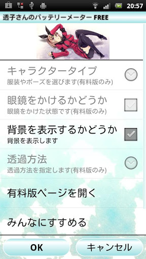 A beautiful 2D anime girl Touko puts off her clothes in response to your smartphone39;s battery life.This is free version.This widget is not so practical to know the residual quantity of the battery life. But it is not impossible to guess rough estimation.
