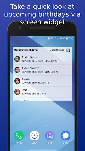 หน้าจอโฮม การแจ้งเตือนปฏิทินภายในแอพคุณสามารถเพิ่มวิดเจ็ตลงในหน้าจอหลักที่จะช่วยให้คุณเห็นวันเกิดที่กำลังจะมาถึงได้อย่างรวดเร็ว