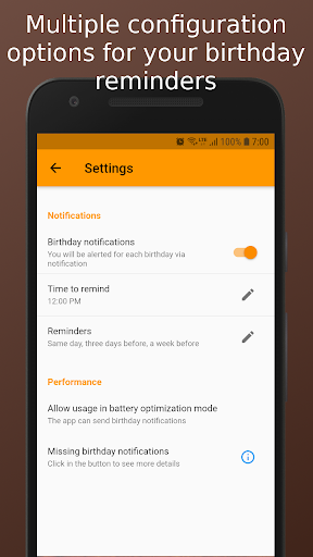 นอกจากนี้แจ้งให้คุณทราบเกี่ยวกับวันเกิดแอพนี้จะสร้างการเตือนด้วยการแจ้งเตือนในวันครบรอบผู้ติดต่อของคุณ
