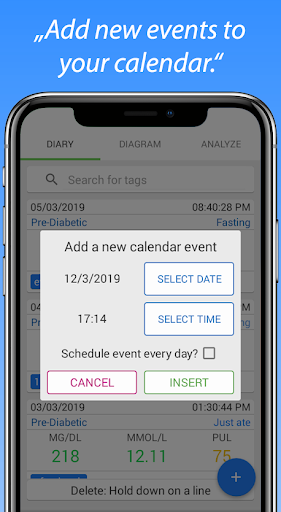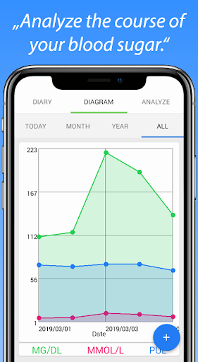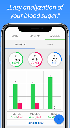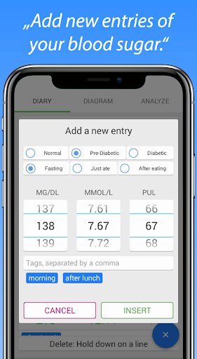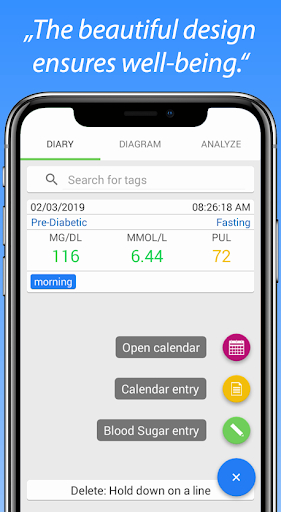 Diary น้ำตาลในเลือดที่กว้างขวางนี้ให้ฟังก์ชั่นทั้งหมดที่คุณต้องการในการบันทึกติดตามและวิเคราะห์น้ำตาลในเลือดของคุณและชีพจรของคุณ