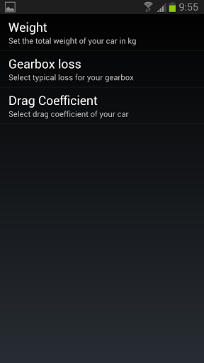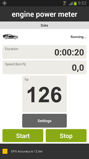 Have you ever wanted to know how powerful you car is? With using “Car Engine Power Meter” you can get info about how many horse powers your engine generates at every moment.You don’t need any special equipment. This application uses GPS as an input to calculate you car's engine power. Its algorithm calculates amount of power that is needed to move the car as it moves.features - it shows current cars's speed - it shows current car's engine power in HPs (horse power)- it shows current GPS accuracy- total car’s weight setting- drive train (gearbox) type for efficiency- drag coefficient (from typical Audi models)So, you don't need Torque Pro, you don't need Torque Lite, you even don't need any OBD1 (OBD-1) or OBD2 (OBD-2 device or connector.Accuracy of measurements and calculations are dependent on the quality of your GPS reception. So, keep in mind that in some occasions measurements can vary from real data