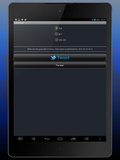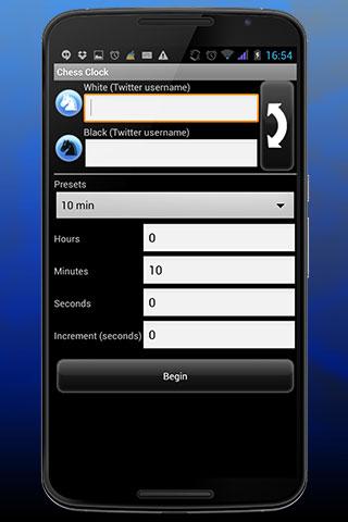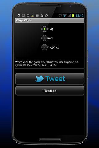 This app allows you tu use your Android device as a Chess Clock. With this app you can play Sudden Death games or games with time increment "Fischer". It also allows you to tweet the result of the game and the number of moves made, so that your friends know how good you are.