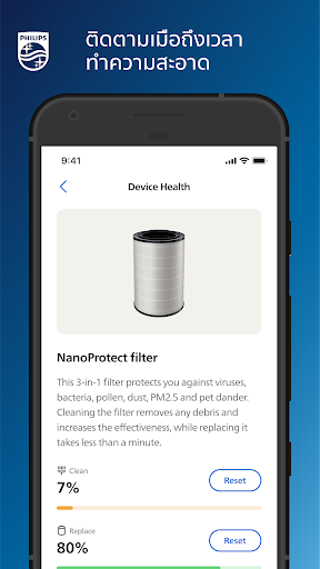 Air ติดตามเมื่อถึงเวลาต้องทำความสะอาดหรือเปลี่ยนชิ้นส่วนอุปกรณ์ Air ของคุณเพื่อให้แน่ใจว่าอุปกรณ์ทำงานอย่างเต็มประสิทธิภาพ ข้อความและการแจ้งเตือนจะแจ้งเตือนคุณเมื่อต้องมีการบำรุงรักษาเล็กน้อย และ Air มีคำแนะนำทีละขั้นตอนที่เป็นประโยชน์หากคุณต้องการ นอกจากนี้ ในกรณีส่วนใหญ่ คุณสามารถซื้อแผ่นกรองใหม่ได้โดยตรงจากแอป
