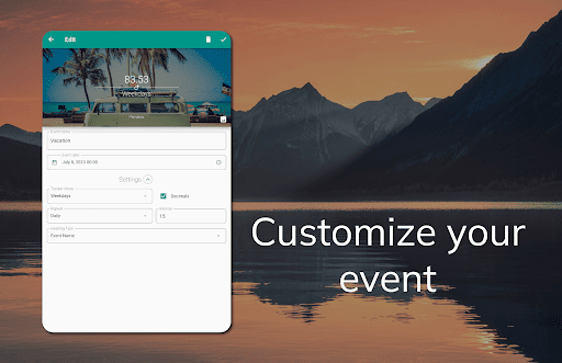ใช้เวลานับถอยหลังเพื่อติดตามเหตุการณ์ใด ๆเหตุการณ์ใด ๆ เลย!ตั้งค่าแอพนับถอยหลังเป็นงานนำเสนอที่ยิ่งใหญ่ติดตามวินาทีจนกระทั่งทานอาหารค่ำสำหรับครอบครัวตั้งวิดเจ็ตให้นับเป็นวันเกิดของคุณหรือวัดปริมาณลมหายใจจนกว่าจะถึงวันที่โรแมนติก