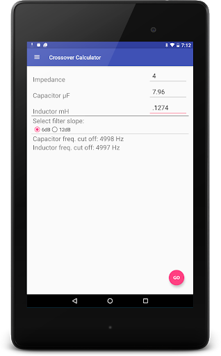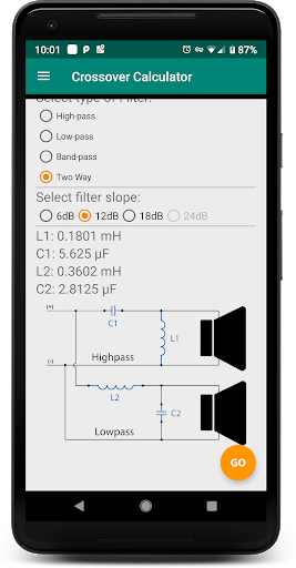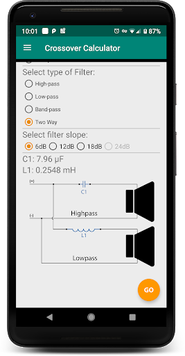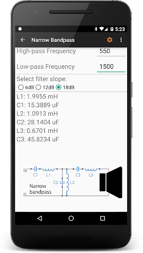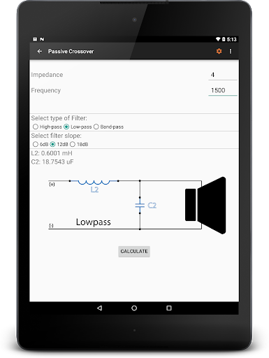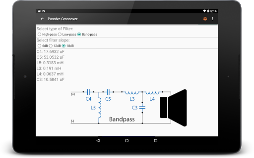 •การคำนวณ Linkwitz-Riley และ Bessel สำหรับ Slopes 12dB และ 24DB ฟรี•การคำนวณ Chebyshev สำหรับความลาดชัน 12dB ฟรีการคำนวณโหลด หากคุณมีลำโพงหลายตัวคุณสามารถคำนวณภาระความต้านทานทั้งหมดได้สูงสุด 5 ค่า