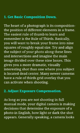 Digital cameras today offer superb image quality that competes directly with film. When it comes to getting the most from the shots you take, there are also loads of tried-and-tested techniques and shortcuts that you can use to guarantee the best results – from finding the perfect location and perfecting composition to getting focus right and nailing exposure. And of course, no matter how much preparation and care you have taken when shooting, you will need to store, sort and edit the images you take. So we will also show you the best ways to cut down the time you spend at your computer. Get some fresh and awesome useful tips, which will make you a PERFECT photographer through our app in your android mobile.