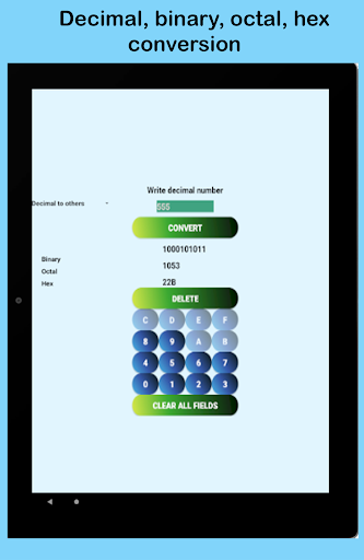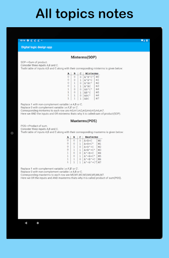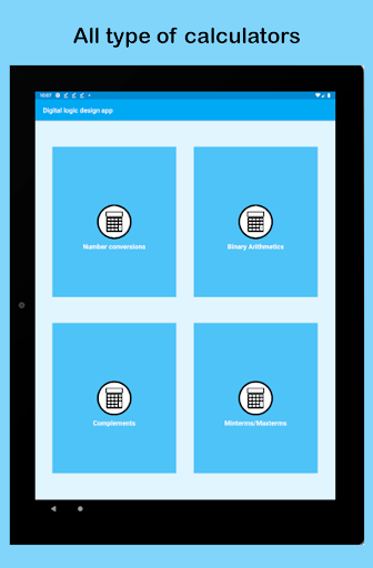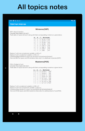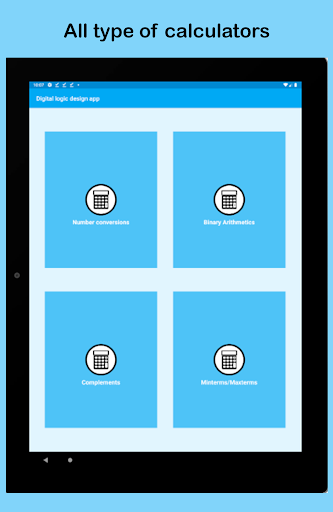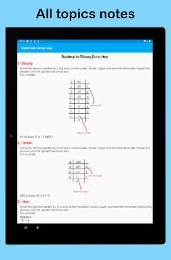 แอพนี้มีประโยชน์มากสำหรับผู้ที่เรียนรู้การออกแบบตรรกะดิจิตอลในวิทยาการคอมพิวเตอร์หรือวิศวกรรมอินเทอร์เฟซได้รับการออกแบบในวิธีที่ง่ายและเป็นมืออาชีพเพื่อความสะดวกของผู้ใช้แอปมีทั้งโน้ตและตัวแปลงเช่นทศนิยมไปยังตัวแปลงไบนารีทศนิยมแปลง Hexa ตัวแปลงไบนารีเป็นทศนิยมเป็นต้นแอปมีบันทึกการออกแบบตรรกะแบบดิจิทัลซึ่งรวมถึงหัวข้อต่อไปนี้: ทศนิยม, ไบนารี, เลขฐานสิบหก, การแปลงฐานสิบหกการเพิ่มและการลบแบบไบนารี