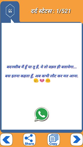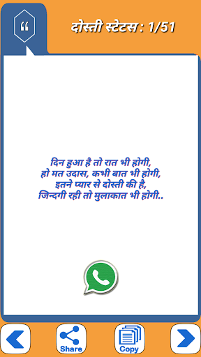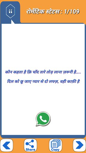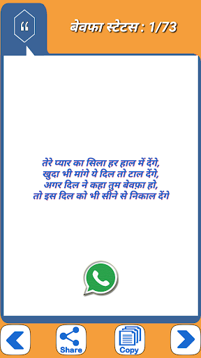 This is one of the best collection of latest Hindi dosti shayari ,love shayari app which is totally free and no internet connection required . Love is one of the important part of human life for share there feelings to some we must need a proper text which is attached by our emotion for that this is best and suitable app for you just use and share ultimate feelings .