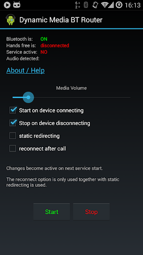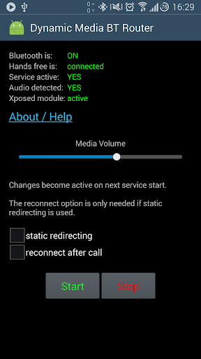 If you choose the reconnect after call option the service restarts itself after a voice call is terminated (the telephone app has priority over the sco channel). The service also restarts if you end the "call" for media redirection. This option is only available in combination with static redirection.
