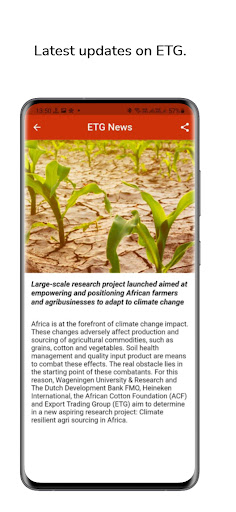 แอพ ETG One Stop Solution อุทิศตนเพื่อเกษตรกรซึ่งช่วยให้เกษตรกรชาวแอฟริกันทำการตัดสินใจอย่างชาญฉลาดโดยการเข้าถึงข้อมูลการเกษตรที่กำหนดเองที่เกี่ยวข้องกับพวกเขา ความต้องการ.