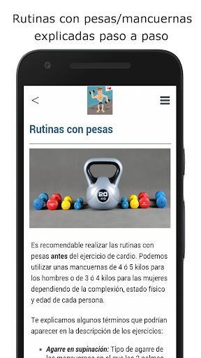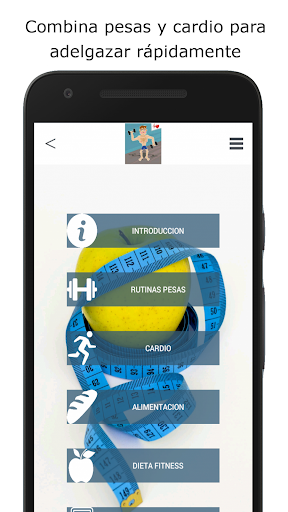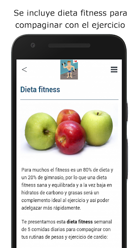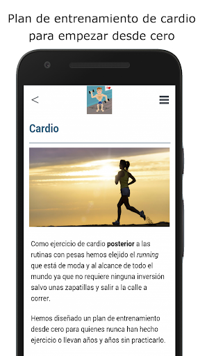แอพนี้รวมถึงการออกกำลังกายที่บ้านสำหรับการฝึกอบรมทั้งสองประเภทเช่นการเพิ่มกล้ามเนื้อมวลและคาร์ดิโอเพื่อ ดำเนินการจากศูนย์และสำหรับผู้ที่ไม่เคยเล่นกีฬาหรือทำมาหลายปีโดยไม่ต้องฝึกฝน 3 วันต่อสัปดาห์เป็นเวลาอย่างน้อย 8 สัปดาห์และมุ่งเน้นไปที่น้ำหนักและลดความอ้วนในวิธีที่มีประสิทธิภาพมากขึ้นโดยไม่ต้องหันไปหาปาฏิหาริย์ ในการลดน้ำหนักที่ท้ายที่สุดอาจทำให้เกิดผลการฟื้นตัวที่น่ากลัว