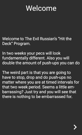 โปรแกรมนี้จะช่วยให้คุณได้รับการแจ้งเตือนในเวลานั้นคุณต้องทำการดันอัพจำนวนเฉพาะโดยใช้โปรแกรม "Hit the Deck" ที่ชั่วร้าย คุณไม่จำเป็นต้องตั้งค่าการแจ้งเตือนให้ทำเพียงทำสิ่งที่คุณทำและรอการแจ้งเตือน โปรแกรมนี้ช่วยให้ได้รับผลประโยชน์จากการออกกำลังกายของคุณ