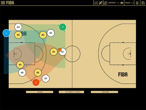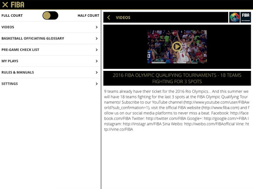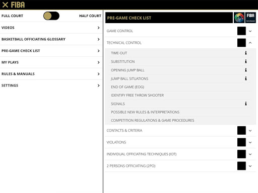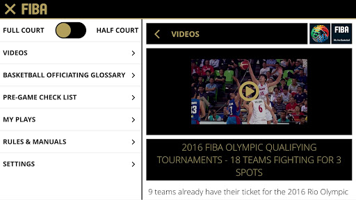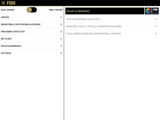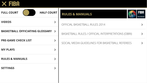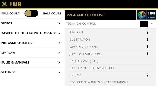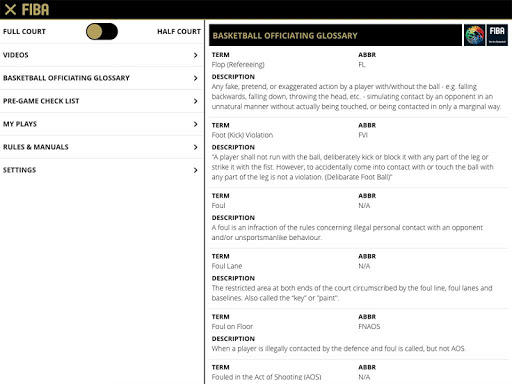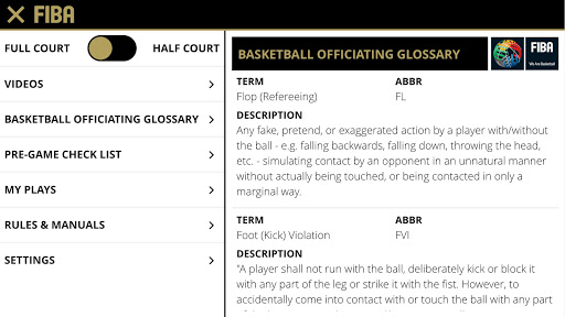 Includes videos, basketball officiating glossary, pre-game checklist with designated groups for officiating, technical manuals, FIBA basketball rules and official interpretations (OBRI), full & half court with referees, players, coverage area symbols, drawing tool, able to save your own play-situations.