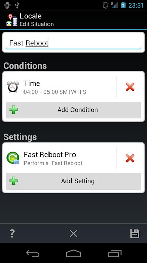ปลั๊กอินนี้รวมแอป "Fast Reboot Pro" (http://goo.gl/wv4py) ด้วยโลแคลและ Taskerต้องการทำการรีบูตอย่างรวดเร็วโดยอัตโนมัติเมื่อแบตเตอรี่ของคุณลดลงต่ำกว่า 30%?หรือทำการรีบูตอย่างรวดเร็วในแต่ละครั้งในระหว่างวัน?ตอนนี้คุณสามารถ!