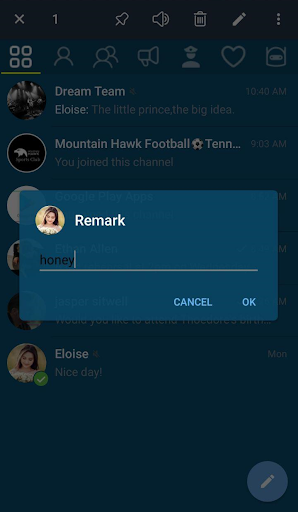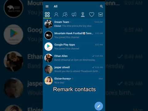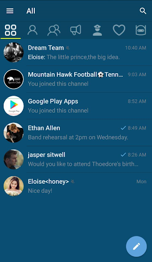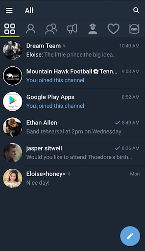 • Multiple tabs for categorization of different chats: users, groups, channels, bots, favorites, admin or creator.