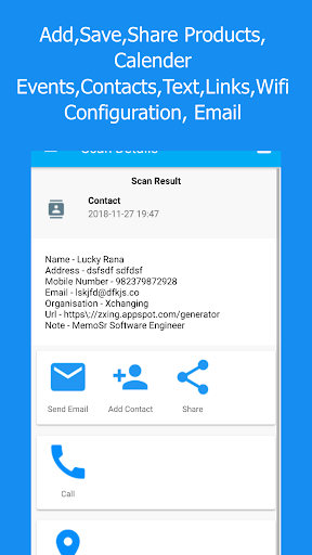 เครื่องสแกนโค้ด QR และเครื่องสแกนบาร์โค้ดสามารถสแกนข้อความอ่านและถอดรหัสสแกนเนอร์, ISBN, ผลิตภัณฑ์, ติดต่อ, ปฏิทิน, อีเมล, สถานที่, Wi-Fi และรูปแบบอื่น ๆ ของ QR & บาร์โค้ด หลังจากสแกนและถอดรหัสอัตโนมัติผู้ใช้จะได้รับเฉพาะตัวเลือกที่เกี่ยวข้องสำหรับแต่ละ QR หรือประเภทบาร์โค้ดและสามารถดำเนินการที่เหมาะสม ซึ่งแตกต่างจากผู้อื่นเรารู้ว่าข้อมูลใดที่เกี่ยวข้องกับผู้ใช้และการกระทำที่เป็นไปได้สามารถติดตามการสแกน QR หรือบาร์โค้ดประเภทต่าง ๆ ได้ที่สแกนเนอร์ QR Code & Barcode Scanner ยังมีอาร์เรย์เต็มรูปแบบของตัวเลือกการแชร์ กับเพื่อนและคนอื่น ๆ ของคุณโดยใช้วิธีการติดต่อโดยตรงหรือเครือข่ายสังคมที่มีชื่อเสียง (Facebook, Twitter, WhatsApp ... ) |