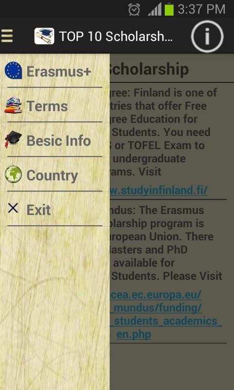 The App mainly contains brief description of Free Scholarships opportunities by Country. Those popular Countries that offer Scholarships are included in the App. You will find European, USA, and Asian scholarships ans also Christian and Islamic Scholarships are included.