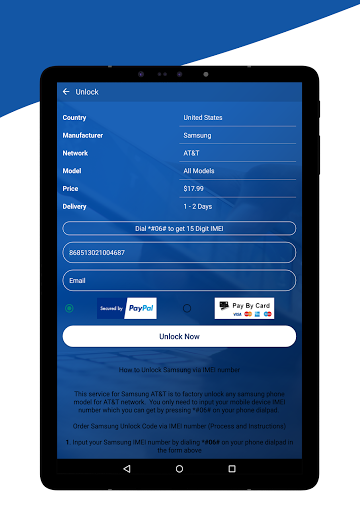 ฟรีรหัสเครือข่าย / IMEI SIM Unlocker สำหรับ Samsung สามารถปลดล็อก AT & T โทรศัพท์ Samsung สำหรับลูกค้าที่กำลังเดินทางไปต่างประเทศขายอุปกรณ์ Android ของพวกเขาเป็น "ปลดล็อค" หรือเพียงไม่ต้องการใช้ AT & T ต่อไปโดยไม่ต้องซื้ออุปกรณ์ใหม่ แอพปลดล็อคเครือข่ายปลดล็อกของเราสามารถปลดล็อกเกือบทุกอุปกรณ์ AT & T ได้ถึงวันที่ ดังที่ได้กล่าวไว้ก่อนหน้านี้แอปปลดล็อคเครือข่ายของเราสามารถปลดล็อกอุปกรณ์ Android ที่แม้แต่ AT & T ไม่สามารถปลดล็อคตัวเองและรุ่น Samsung ซึ่งพวกเขาไม่สามารถปลดล็อคได้