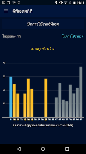 - สัญญาณจีพีเอส (SNR) แผนภูมิแท่ง - แสดงความแรงของสัญญาณดาวเทียมสำหรับแต่ละเช่นเดียวกับความถูกต้องและสถานะของจีพีเอส ข้อมูลจาก Glonass, Beidou และดาวเทียมจีพีเอสจะแสดง