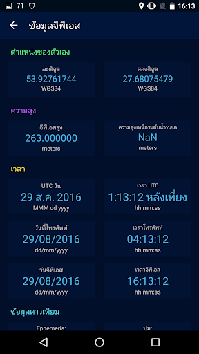 ข้อมูล GPS สถานะการช่วยให้คุณสามารถตรวจสอบคุณภาพสัญญาณ GPS, GPS โมดูลทดสอบดาวเทียมนับคุณภาพสัญญาณให้ดูความเร็วของคุณกับวัดความเร็วจีพีเอสตรวจสอบเวลาการแก้ไข GPS และข้อมูล GPS อื่น ๆ