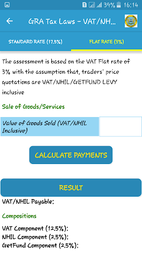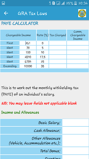 มันช่วยให้คุณคำนวณการจ่ายเงินตามที่คุณได้รับ (PAYE) ภาษีและประเมิน VAT / NHIL.ASSESSTMENT รายเดือนของคุณนอกจากนี้ยังสะกดผิดกฎหมายภาษีต่าง ๆ ในประเทศ