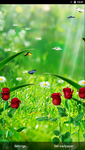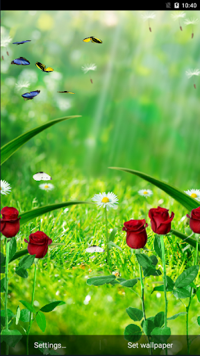 Garden Live Wallpaper เป็นภาพวอลล์เปเปอร์ที่สดใสของวอลล์เปเปอร์ในสวนที่มีหญ้าจำนวนมาก, ดอกกุหลาบ, ดอกแดนดิไล, การเคลื่อนไหวเดียวกันของลมบนหน้าจอและผีเสื้อที่บินข้าม,
