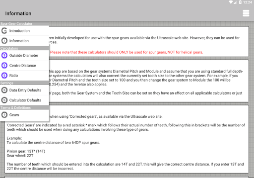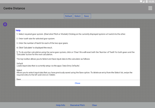 The two gear systems used in this app are Diametral Pitch and Module and assume you are using standard full depth-teeth. When switching gear systems the calculators will also convert the currently set tooth size to the new gear system. For example if you have the calculators set for Diametral Pitch and the Tooth Size set to 100 and you then change the gear system to Module the 100 will be converted to Module (i.e. 0.254) and the reverse also applies.