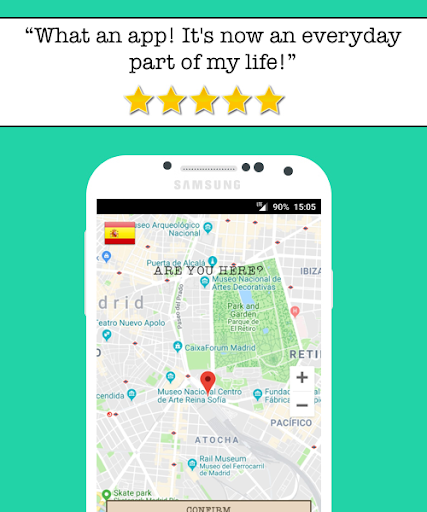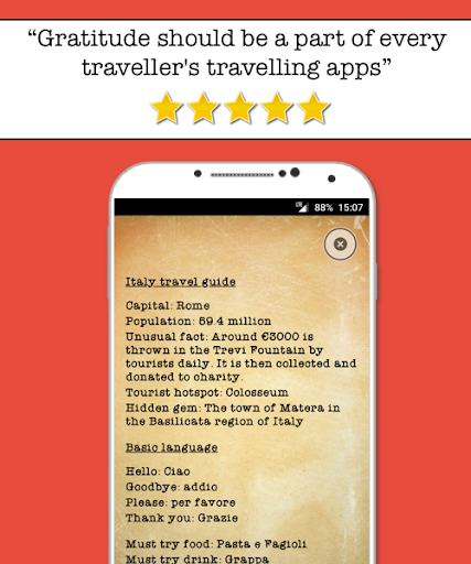 The app includes a mini travel guide for each country helping you with basic dialect, informing you of tourist hotspots and hidden gems and providing basic facts about your location.