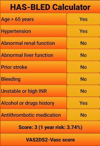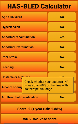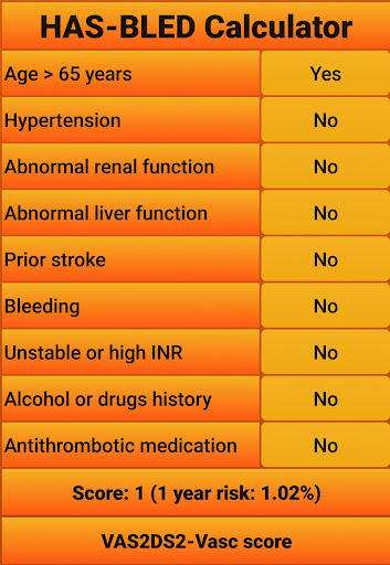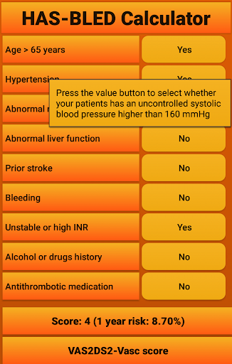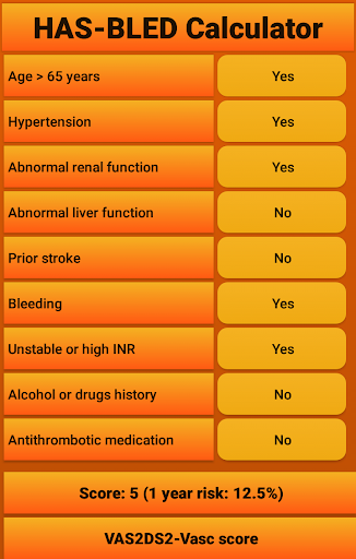 Fast, free and easy to use app for calculating the HAS-BLED score (https://en.wikipedia.org/wiki/HAS-BLED), including a link to an CHA2DS2-VASc app (which has a link to the most recent treatment standards). The risks associated with the calculated scores were taken from the original HAS-BLED publication which can be found at https://www.ncbi.nlm.nih.gov/pubmed/20299623.
