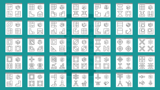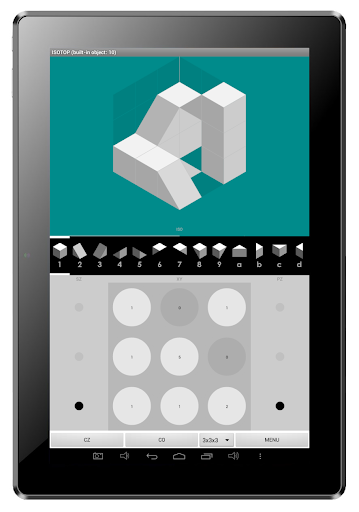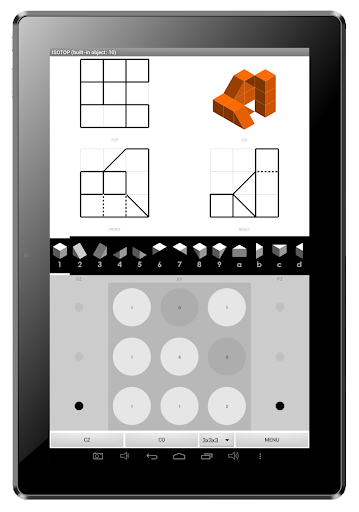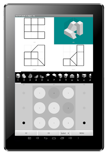 แอพนี้ช่วยให้สามารถสร้างวัตถุที่มีมิติเท่ากันนับไม่ถ้วนโดยใช้ 13 ก้อนที่แตกต่างกันและบล็อกที่มีรูปลิ่มที่แสดงการคาดการณ์แบบ orthographic (ด้านบนมุมมองด้านหน้าและด้านข้าง) พร้อมโครงร่างของใบหน้าของ Coplanar และเส้นที่ซ่อนอยู่