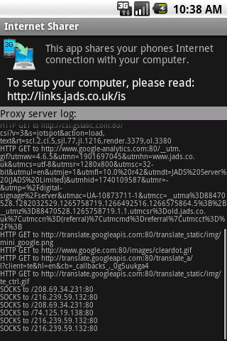 shares your phones internet connection with your computer. NOT FOR NOVICE USERS Help page: http:links.jads.co.ukisPC Wizard helper application available.Root NOT requiredIncludes a basic HTTP and SOCKS proxy server.For a faster and more reliable implementation of HTTP and HTTPS proxies for android please purchase JADS HTTP amp; HTTPS Proxy.
