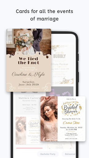 พิธีแต่งงานคือการรวมกันของหลาย ๆ กิจกรรมและเราให้ตัวเลือกในการสร้างการออกแบบการ์ดแต่งงานสำหรับกิจกรรมที่แตกต่างกัน คุณสามารถเลือกห้องอาบน้ำเจ้าสาวพรรคหมั้นมื้อค่ำการซ้อมและปาร์ตี้ปริญญาตรี มันเป็นเครื่องเชิญงานแต่งงานที่สมบูรณ์แบบ