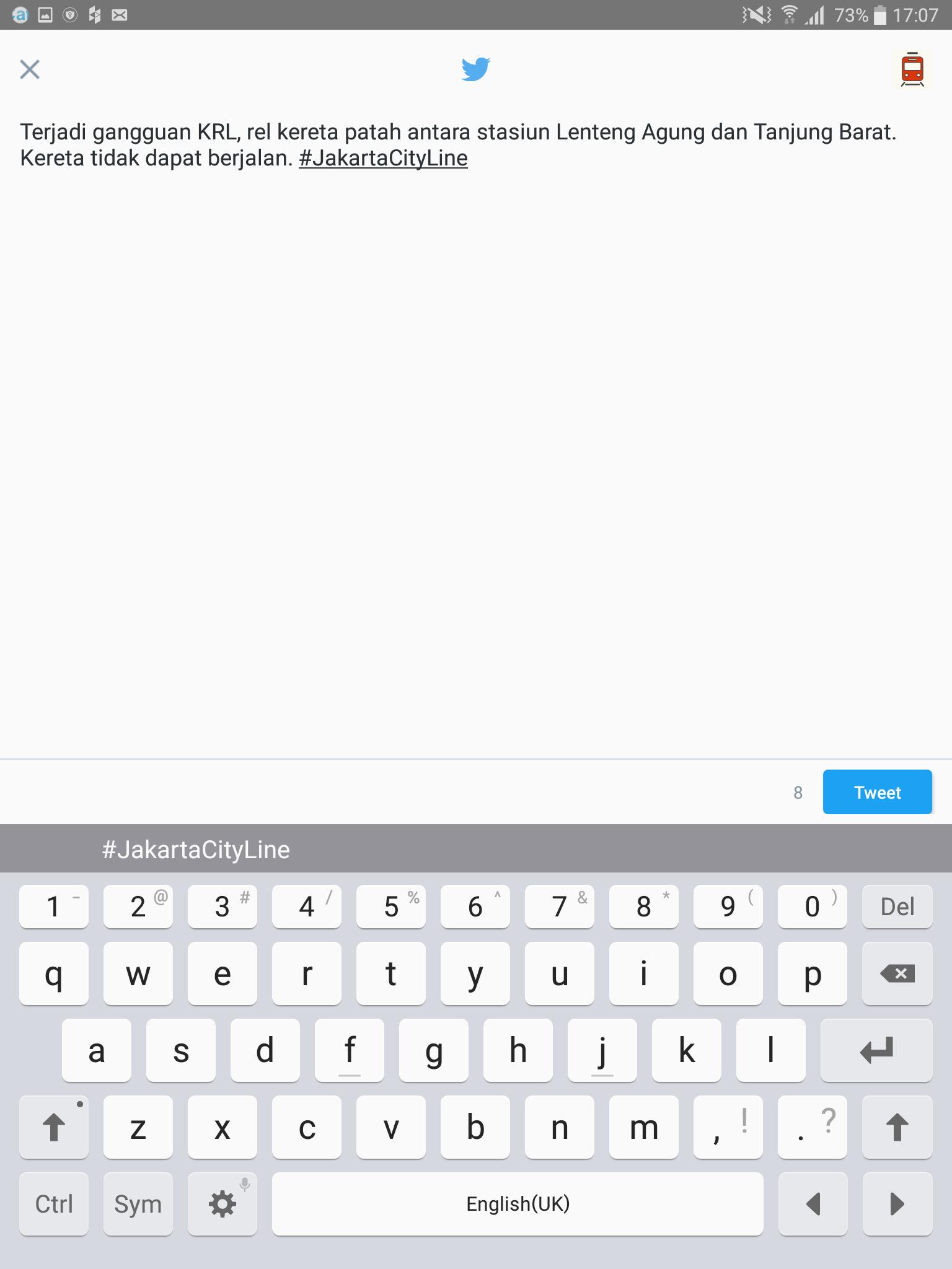 Jakarta City Line is an application that provides information about KRL commuter train schedule and its trip in Jakarta, Indonesia. It is developed with a touch of innovation and great user experience. This application is dedicated to commuter train users who support public transportation use in Indonesia. You can use this application to check real-time train position, get and share the latest info about the train. Enjoy your trip together with Jakarta City Line.