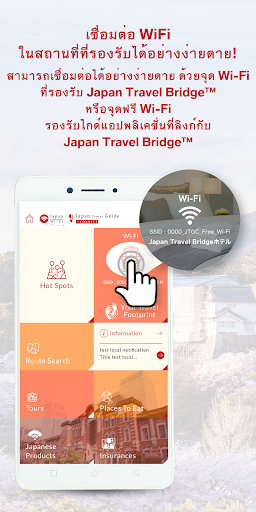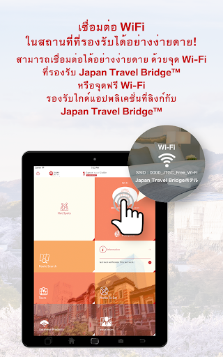 สามารถเชื่อมต่อได้อย่างง่ายดาย ด้วยจุด Wi-Fi ที่รองรับ Japan Travel Bridge™ หรือจุดฟรี Wi-Fi รองรับไกด์แอปพลิเคชั่นที่ลิงก์กับ Japan Travel Bridge™ (อยู่ระหว่างขยายสถานที่เป้าหมายตามลำดับ)